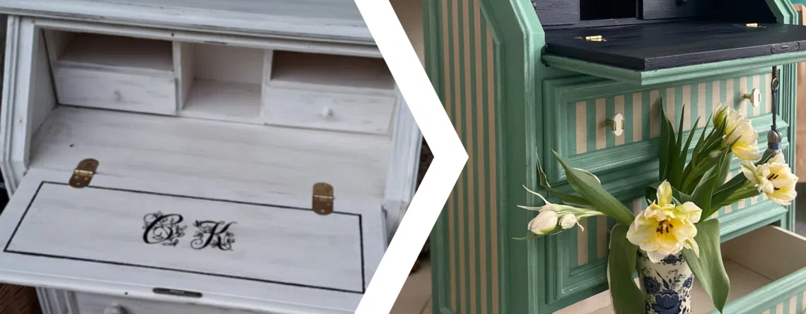 Je suis assez fière d’une de mes dernières créations : un petit secrétaire sauvé par une de mes clientes en déchèterie. Je l’ai peint avec un motif rayé qui m’a demandé plusieurs heures de travail. Il se trouve aujourd’hui dans un appartement où il est parfaitement mis en valeur.